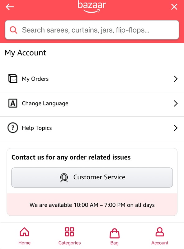 Although you are accessing this within Amazon App, but it works and behaves like a separate app. As you can see from the above screen grabs, everything is a cut down version of the main app. Including the account section. Even the customer care section is also a cut down version. There are no 24×7 Customer Service.