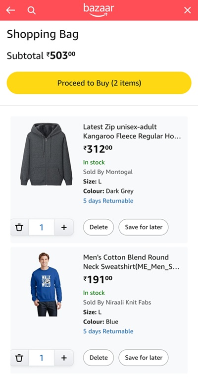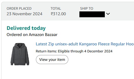 So I thought let’s order from their clothing section. Searched around and found a “round neck cotton blend full sleeve sweatshirt for Rs. 191/- and a Zip type hoodie with Pockets. For two of those, its Rs. 503/- total. Both these products come with 5 days return policy.