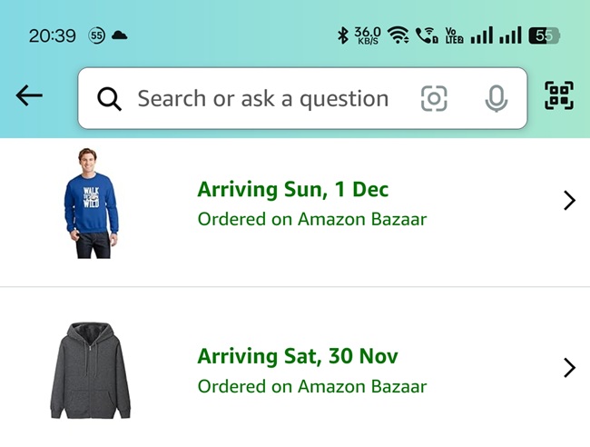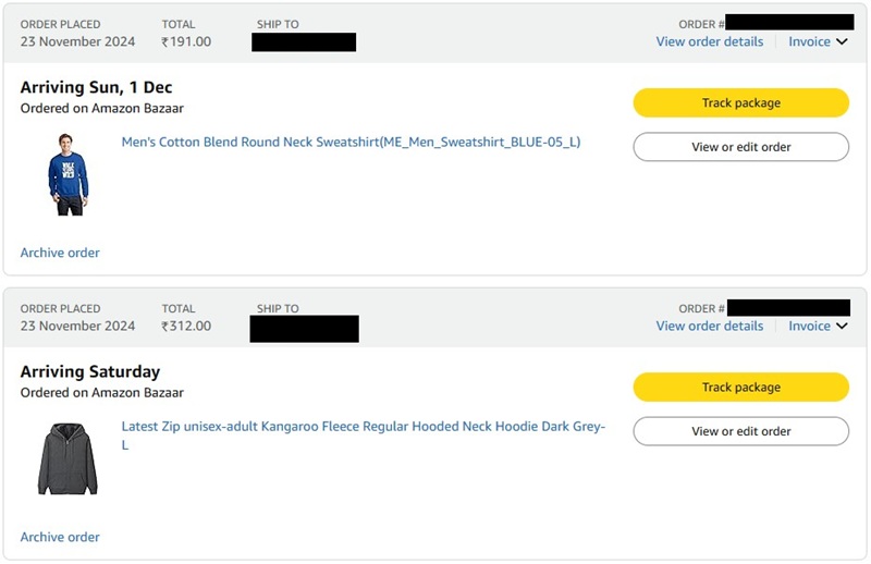 After the successful order, the main amazon app and website are now showing both the orders along with tracking. Although the products from Amazon Bazaar is Amazon Delivered but no Prime benefit available here, like, same day or next day shipping. For my location of Kolkata, the estimated delivery date is around 7-8 days for both of these products.