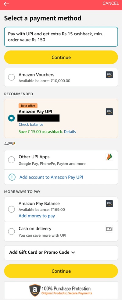 Paying via Amazon Pay UPI is offering Rs. 15/- cash back (Amazon Pay Balance) on each order.