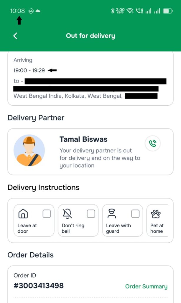1. -> Delivery location won’t update automatically. Unlike Zomato, Swiggy or such, Jiffy app wont fetch the present location and always stick to the last ordered delivery address. So by mistake, I have ordered at wrong location multiple time. There is no way to modify or cancel the order after placing.