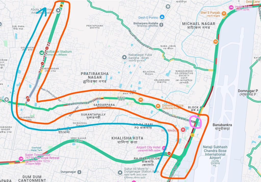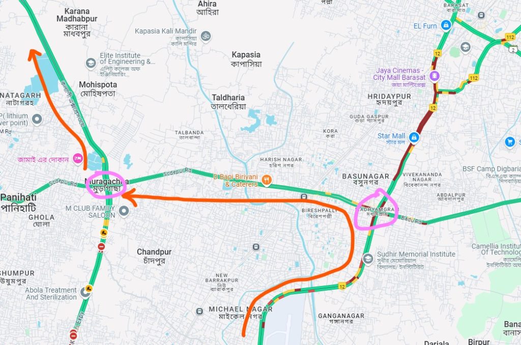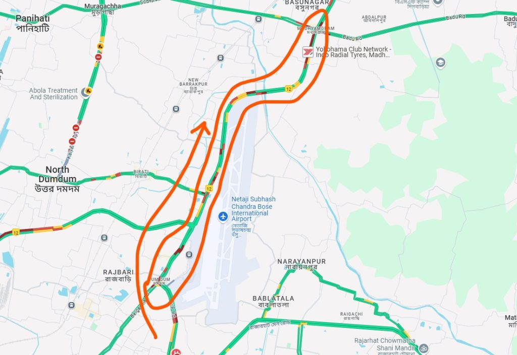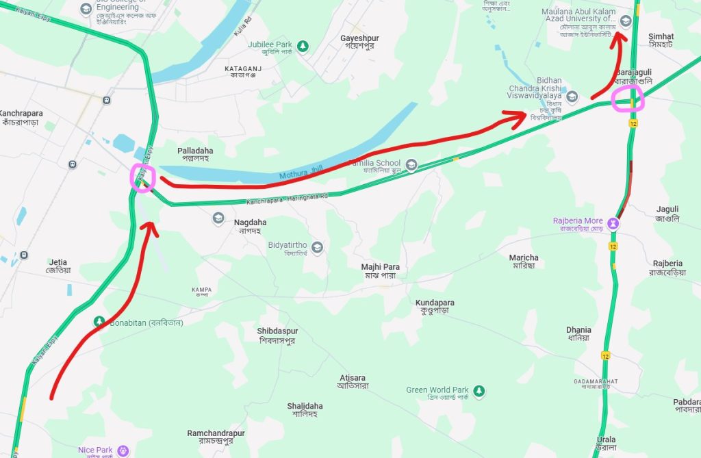 There is a single lane, really poor, under construction section after “Barasat” and between “BaraJaguli”. You should bypass that section via newly constructed Kalyani Expressway. At the time of writing this article, the best option to divert is at “Madhyamgram Chowmatha” (four way junction). However, during peak (office) hours and at night hours, there is a possibility of heavy traffic jam just before the juction. Do consult the Google Maps. In case the junction is showing red in Google Maps traffic, you can also use the “Birati More” leave NH12/NH34 and connect to Kalyani Expressway.