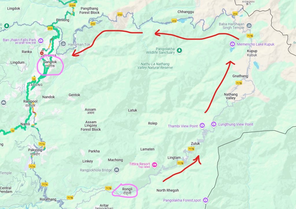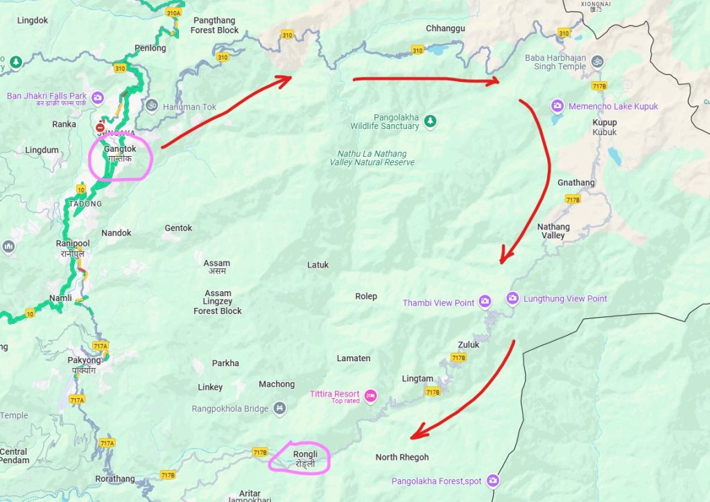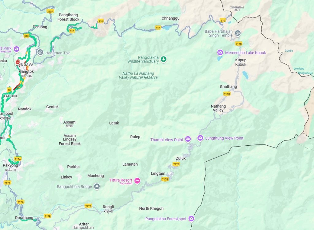 Pangthang Forest / Chhanggu Lake / Nathu La Pass / Baba Mandir / Kupup Lake / Gnathang / Nathang Valley / Thambi & Lungthung View Point / Zuluk / Lingtham -> This entire route itself.