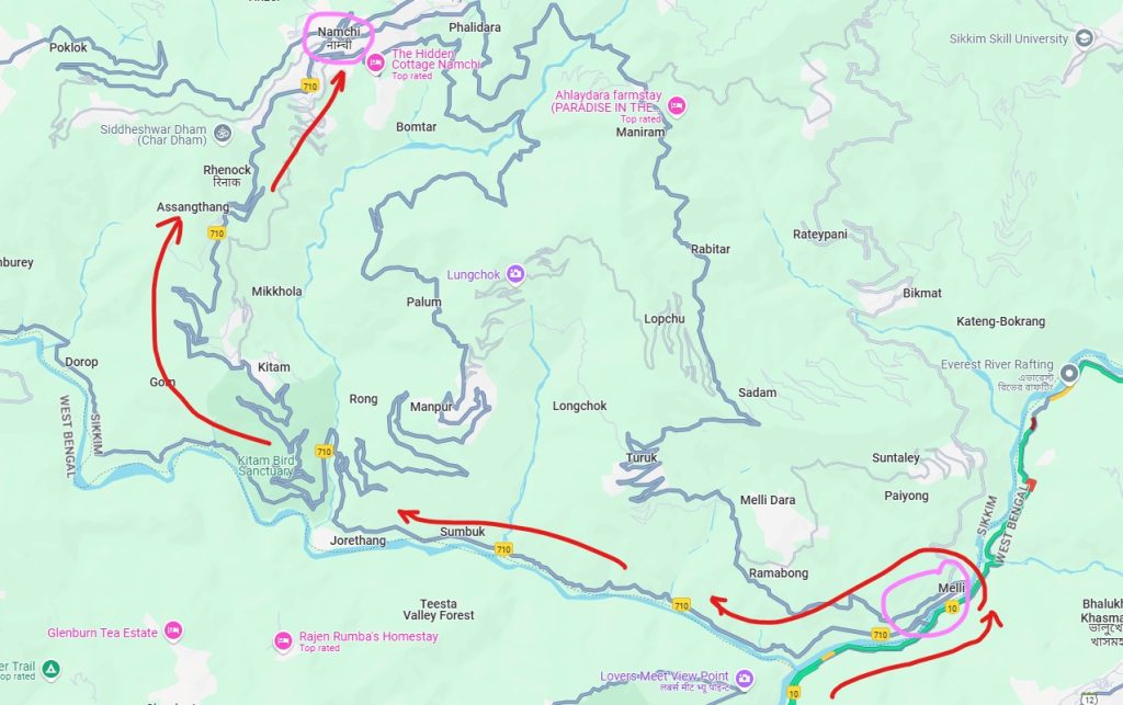 Looking at the poor road conditions, we may advise you to select Namchi as your first destination of West Sikkim. After crossing into Sikkim via this Melli Bridge (right after Teesta Bazar), take the NH710 all the way up to Namchi.