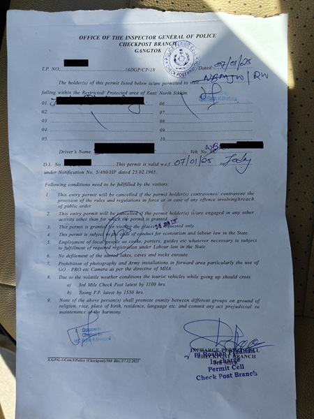 There are two entry and exit point for this route. Gangtok and Rongli. Permits are issued from both these places. Permits are issued as is following format,