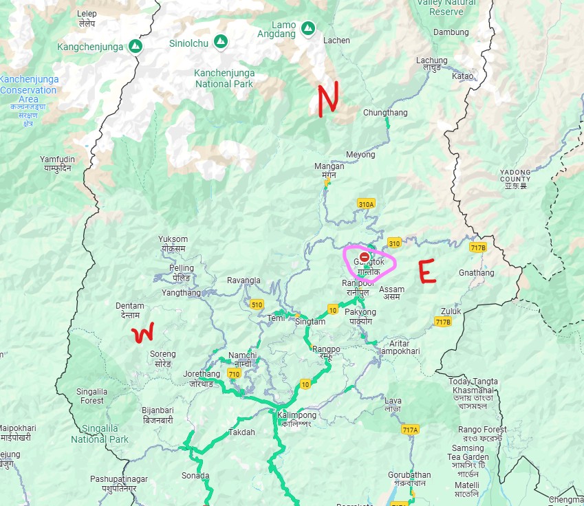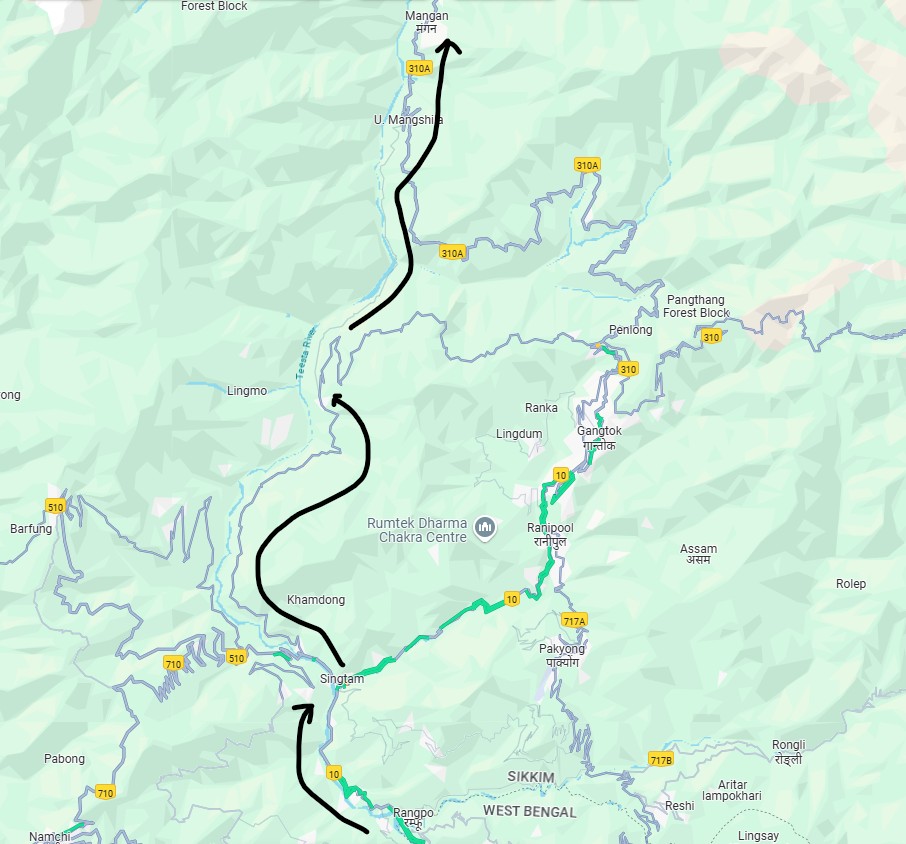 Technically speaking, one can take a direct and shorter route to Mangan from Siliguri via Dikchu. From Siliguri, one can take NH10 via Sevok Road then Kalimpong and then cross into Sikkim via Rongpo (WB – Sikkim Border). From Rongpo, NH10 up to Singtham then divert left onto Singtham Dikchu road till Dikchu and then up to Mangan as shown in the map below,