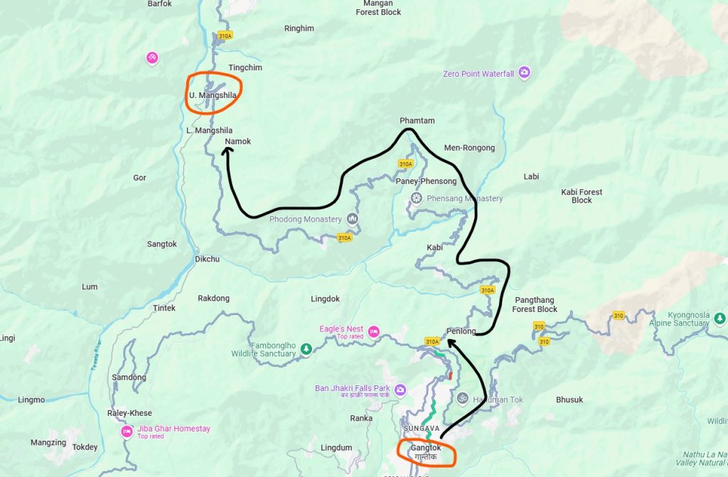 First Section (Gangtok to Mangan) -> Start early from Gangtok by 6:30AM and follow the NH310A up to Lower Mangan (U. Mangshila).