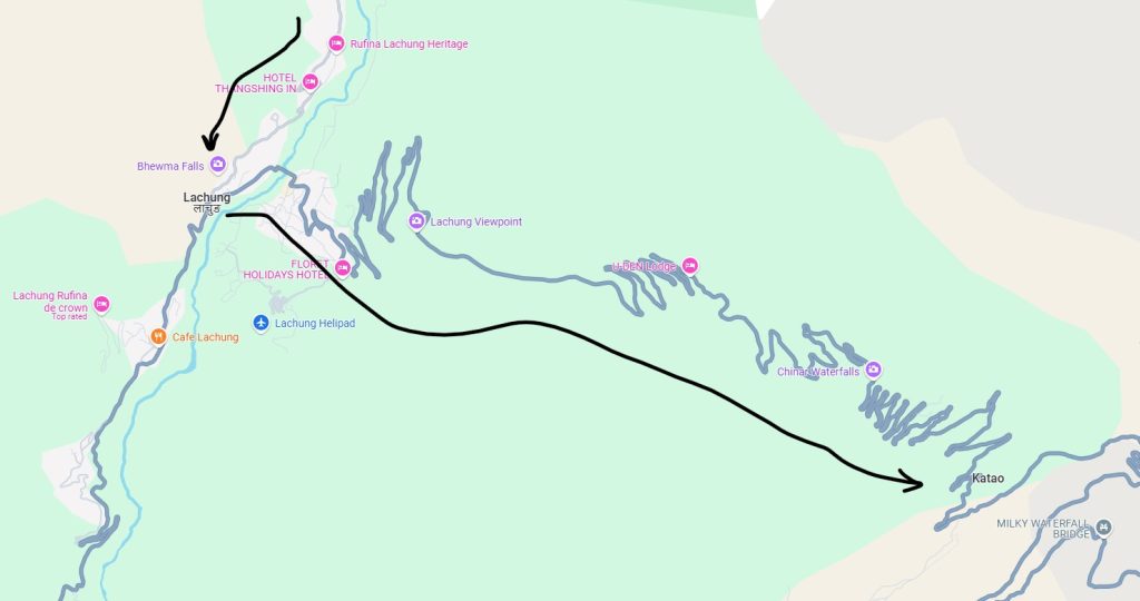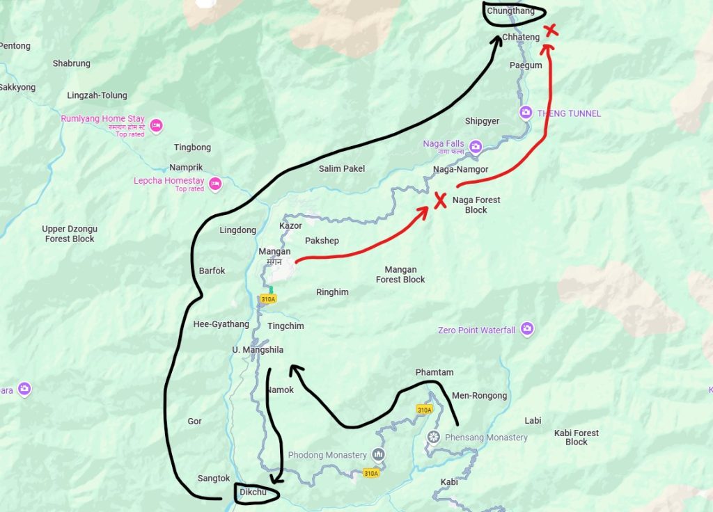 3rd Section (Dikchu to Chungthang) -> Earlier, the main route went up from Mangan to Chungthang via Naga Falls. But after 2023 floods, this entire route is washed away and presently under construction. That is why one needs to take this diversion to Dikchu and then cross the river to go to the other side.