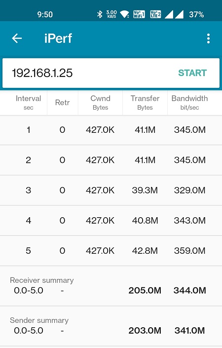 • Test 2 -> iPerf network stress testing (LAN Connected PC as server to OP8T as client)