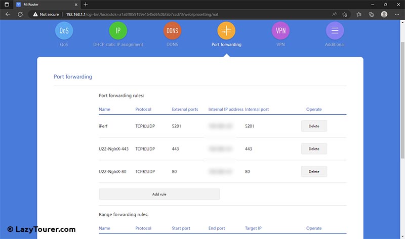 • Port Forwarding -> Under this tab, you can setup port forwarding rules along with DMZ